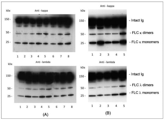 Serum FLC monomer-dimer patterns in healthy state (blot (A)) and MGUS (blot (B)). Serum samples were run using SDS-PAGE under non-reducing conditions on 10–20% Tris-glycine gels and immunoreacted with antibodies to κ and λ light chains. Bands of 25 and 50 kDa represent FLC monomers and dimers, respectively. Blot (A) displays the FLC monomer-dimer patterns of sera from 7 healthy subjects (Tracks 2–8). Blot (B) demonstrates monomer-dimer patterns of sera from 4 MGUS patients (Tracks 2–5). A reference sample (Track 1) composed of a mixture of serum samples from 15 healthy subjects was run alongside the tested samples (blots (A,B)). Compared to healthy subjects, patients with MGUS showed either normal FLC monomer-dimer patterns or increased levels of the monomeric FLC. FLC—free light chains; MGUS—monoclonal gammopathy of unknown significance; SDS-PAGE—sodium dodecyl sulphate–polyacrylamide gel electrophoresis (from Figures 2 and 4 in [], by permission from John Willey and Sons).