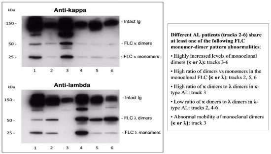 Serum FLC monomer-dimer patterns in AL amyloidosis. Serum samples were run using SDS-PAGE under non-reducing conditions on 10–20% Tris-glycine gels and immunoreacted with antibodies to κ and λ light chains. Bands of 25 and 50 kDa represent FLC monomers and dimers, respectively. Track 1—serum reference sample composed of a mixture of serum samples from 15 healthy subjects. Serum FLC monomer-dimer patterns in AL amyloidosis (Tracks 2–6) differ significantly from that in a healthy state in at least one feature delineated in the adjacent textbox: increased levels of monoclonal FLC dimers, increased monoclonal dimer/monomer ratio, and aberrant κ/λ ratio of dimeric FLC. AL—light chain amyloidosis; FLC—free light chains; SDS-PAGE—sodium dodecyl sulphate–polyacrylamide gel electrophoresis (from Figure 1 in [], by permission from John Willey and Sons).