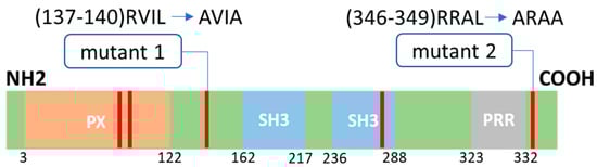 NADPH oxidases represent a family of enzymes whose main and primary function is to produce ROS. This family is composed of seven different NADPH oxidase enzyme complexes (Nox1 to 5; Duox1 and Duox2) []. Phosphorylation of the Nox2 complex has long been identified as a regulator of the oxidative burst in neutrophils []. Nox2, as an active ROS-producing center, is activated by its association with the other subunits of the NADPH oxidase complex (p47phox, p67phox, and Rac). Phosphorylation of p47phox by protein kinases C (PKC) results in exposure of the tandem SH3 domain in the central region of p47phox, a domain that is masked when the protein is unphosphorylated by a folding of the AIR (auto-inhibitory region) sequence of p47phox. Once unmasked, the SH3 sequence of p47phox can interact with the proline-rich region (PRR) of p22phox and a PRR in the COOH-terminal region of p47phox for binding to the SH3 domain of p67phox, leading to activation of the Nox2 complex [].