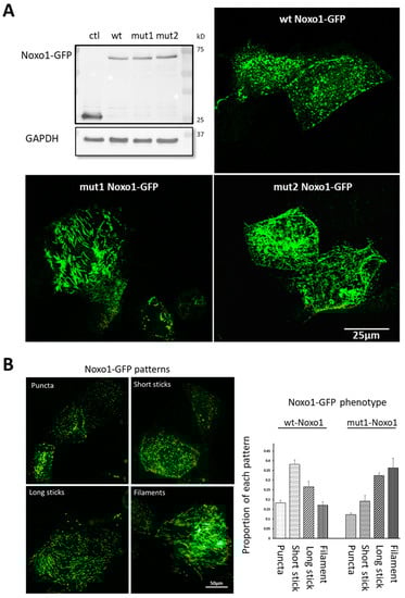 Effects of the overexpression of Noxo1-GFP on the pattern of Noxo1 in Caco-2 cells. (A, upper left) Immunoblot of control GFP (ctl), wt Noxo1-GFP, mut1-GFP, and mut2-GFP overexpression. GAPDH was used as the loading control. The ctl corresponds to transfection with the GFP vector. (A, upper right and lower panels) Immunofluorescence images for GFP overexpressing wt Noxo1-GFP, mut1 Noxo1-GFP, or mut2 Noxo1-GFP, respectively. Confocal immunofluorescence imaging projections show that the wt Noxo1-GFP displays a punctate pattern while mutants exhibited a more filamentous pattern. In all panels, scale bar: 25 µm. (B, left) illustrate different Noxo1-GFP patterns, including puncta, short sticks, long sticks, and filaments. Scale bar in all panels: 50 µm. (B, right) quantitative analysis of each pattern in both wt Noxo1-GFP and mut1 Noxo1-GFP obtained using HCS Operatta. Scale bar: 50 µm.