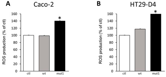 ROS production in Caco-2 and HT29-D4 cells overexpressing ctl, wt Noxo1-DDK or mut1 Noxo1-DDK. (A,B) Illustrate ROS production in Caco-2 and HT29-D4 cells overexpressing ctl, wt Noxo1-DDK, or mut1 Noxo1-DDK. Mut1 Noxo1 overexpression induced a significant increase in ROS production in both cell types compared to ctl or WT. * p < 0.05 compared to ctl.