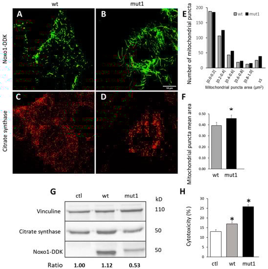 During stress, the fusion of mitochondria allows functional mitochondria to complement dysfunctional mitochondria by diffusion and sharing of components between organelles []. We followed the organization of mitochondria in cells overexpressing wt Noxo1-DDK (Figure 4A, green) and mut1 Noxo1-DDK (Figure 4B, green) with the immunostaining of citrate synthase (Figure 4C,D, red), an enzyme expressed in the mitochondrial matrix []. Figure 4A–F shows that mut1 Noxo1 expression induces a reorganization of citrate synthase analyzed by immunofluorescence compared to that of wt Noxo1. Figure 4E shows the distribution of the mitochondrial puncta areas in wt Noxo1-DDK and mut1 Noxo1-DDK-expressing Caco-2 cells. Mut1 increases all but the smallest size of mitochondrial puncta as compared with those of wt Noxo1-DDK. Quantitative data showed that, in mut1 Noxo1-GFP-expressing Caco-2, the average mitochondrial puncta area was significantly bigger (7%) than that in wt Noxo1-DDK (p < 0.05, Student’s test) (Figure 4F). This increase in mitochondrial puncta area cannot be explained by an increase in citrate synthase expression, as shown by immunoblot in Figure 4G. Finally, overexpression of both wt and mut1 Noxo1 induces a significant increase in cytotoxicity compared to control vector overexpression. Wt Noxo1 increased the cytotoxicity by almost 36% (p < 0.05), while Mut1 increased cytotoxicity by 100% (p < 0.05, ANOVA followed by Tukey’s test) compared to ctl. This observation may be due to the greater increase in ROS production induced by mut1 Noxo1 compared to wt Noxo1.