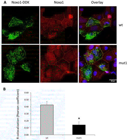 To characterize the mechanism of action of the mut1 mutation, we observed the localization of mut1 Noxo1 and wt Noxo1 with the activator partner Noxa1 by fluorescence immunostaining on cells overexpressing the ctl vector, wt Noxo1 or mut1 Noxo1 in Caco-2 cell line. From the immunofluorescence images in Figure 5A, we see that the colocalization of wt Noxo1 (green) with endogenous Noxa1 (red) is rather at the level of the cell membrane involved in intercellular contacts, while much less for mut1 Noxo1 (green) with Noxa1 (red). The expression of mut1 Noxo1 seems to lead rather to colocalization with Noxa1, which is shared between membrane areas and areas of the presence of Noxo1 filament. Indeed, the quantitative analysis of colocalization Pearson coefficient (R colocalization) in Caco2 between Noxo1 and endogenous Noxa1 was significantly higher in wt noxo1 cells (3-fold, * p < 0.05) compared to that mut1 noxo1 (Figure 5B).