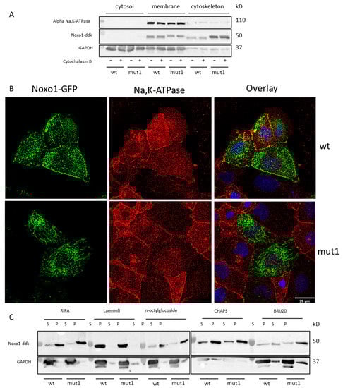 Transfected Caco-2 cells with wt Noxo1 or mut1 Noxo1 were fractionated into cytosolic, membrane, and cytoskeleton fractions using a cell fractionation kit, and the same amounts (35 µg) of these fractions were analyzed by Western blot for specific markers: Glyceraldehyde-3-phosphate dehydrogenase (GAPDH) as cytosolic and membrane marker [,,] and alpha Na,K-ATPase as a membrane marker []. GAPDH, and alpha Na,K-ATPase proteins were detected as a single band with molecular weights of 38 and 100 kDa, respectively, in transfected Caco-2 cells. In all transfected Caco-2 cells, GAPDH is mainly present in the cytosol and membrane fractions and at much lower levels in the cytoskeleton fraction (Figure 6A), consistent with its cytosol and membrane abundance. In contrast, alpha Na,K-ATPase was present in the membrane fraction at higher levels compared to the cytosol and cytoskeleton fractions, confirming its membrane enrichment. The results in Figure 6A show that wt Noxo1 is predominantly localized in the membrane fraction and, to a lesser extent, in the cytoskeleton fraction. This localization is reversed for mut1 Noxo1, which means it is mainly in the cytoskeleton fraction and, to a lesser extent, in the membrane fraction. Noxo1-wt and Noxo1-mut1 are not detected in the cytosolic fraction. Note that the addition of cytochalasin B (1 µM) for one hour before cell lysis does not alter the distribution of wt Noxo1 and mut1 Noxo1. This suggests that the actin cytoskeleton is not a direct player in Noxo1 compartmentalization. Immunostaining using an antibody against a membrane marker, alpha Na,K-ATPase, in cells expressing wt or mut1 Noxo1 presented in Figure 6B supports the observations obtained with the cell fractioning. Wt Noxo1 shows partial colocalization with the membrane alpha Na,K-ATPase mainly at the cell membrane, while this colocalization is not observed for the mut1 Noxo1. Finally, the immunoblot for the pellet and the supernatant of the cell lysis performed in different lysis buffers, using different detergents, shows that only the Laemmli buffer allows the extraction of the totality of the Noxo1 protein (wt or mut1) from the pellet and translocated it into the supernatant (Figure 6C). All other buffers (including RIPA) do not allow the extraction of the majority of Noxo1, which remains mostly in the pellet. Note that mut1 Noxo1 is found to a greater extent in this insoluble pellet fraction than the wt Noxo1, thus explaining the lower presence of mut1 Noxo1 in the soluble fraction (see Figure 4G and Figure 5A).