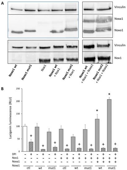 Mut1 Noxo1 increases ROS production in HEK293 cells expressing Nox1-dependent NADPH oxidase complex. (A) Immunoblot of Nox1-dependent NADPH oxidase complex reconstitution. Nox1 was revealed by an anti-Nox1 antibody, Noxo1 and Noxa1 were revealed using an anti-DDK antibody. Vinculin was used as the loading control. Lysis was performed in Laemmli buffer. (B) ROS production by HEK293 cells transfected with pCMV6 entry vector (ctl), wt Noxo1-DDK or mut1 Noxo1-DDK along with Noxa1 and Nox1 measured by lucigenin luminescence. Results represented mean +/− S.E.M percentage of ctl (lane 1) issued from four independent experiments realized in triplicate. In some assay DPI (10 µM, 45 min), a flavoprotein inhibitor known to inhibit Nox1 was used. Both wt Noxo1 or mut1 Noxo1 in the presence of Nox1 and Noxa1 increase ROS production. Mut1 Noxo1 is more potent than wt Noxo1 in inducing ROS production. * p < 0.05 compared to ctl (lane1); + p < 0.05 compared without inhibitor.