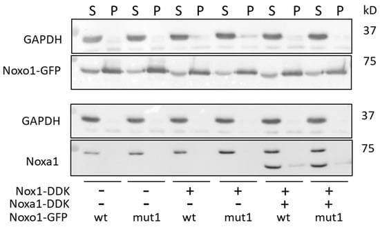 Effect of the expression of NADPH oxidase complex on the distribution of Noxo1-GFP in soluble and insoluble HEK293 cells fractions lysed in RIPA buffer. HEK 293 cells were transfected with wt Noxo1 or mut1 Noxo1 and, Noxa1, Nox1. The result of the expression of these proteins was analyzed by immunoblot using an anti-Noxa1 antibody for Noxa1, an anti-GFP antibody for Noxo1, and an anti-GAPDH antibody for GAPDH. Both wt Noxo1-GFP or mut1 Noxo1-GFP are mainly present in the insoluble fraction (pellet), and to a lesser extent, in the soluble fraction (supernatant). This distribution is independent of whether Nox1 and Noxa1 are expressed endogenously or not. Noxa1 protein is observed almost exclusively in the soluble fraction of RIPA buffer. GAPDH is also mainly present in the supernatant in all conditions and used as the loading ctl.