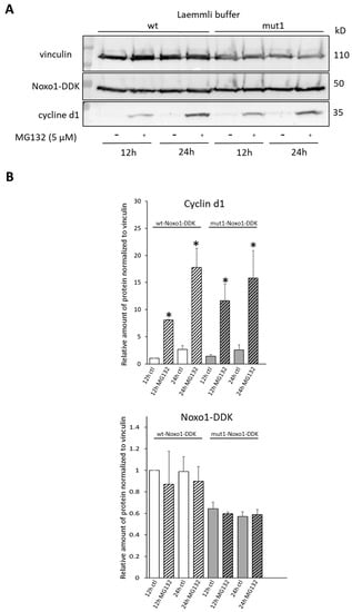 In Caco-2 cells overexpressing wt Noxo1 or mut1 Noxo1, we studied the impact of MG132 (proteasome inhibitor used at 5–10 µM) on Noxo1 stability. Cyclin d1 expression was used as an endogenous degradation positive control and vinculin as a loading control. Since RIPA buffer do not extract all Noxo1 protein from the first pellet after lysis, the transfected Caco-2 cells were lysed in Laemmli buffer (Figure 9A). In Caco-2 cells overexpressing wt Noxo1, the results reported in Figure 9B (left panel) show that MG132 leads to a significant stabilization of cyclin d1 as soon as 12 h (9-fold), which is further enhanced after 24 h (12-fold) of treatment compared to corresponding ctl. In Caco-2 cells overexpressing mut1 Noxo1, MG132 also leads to a significant stabilization of cyclin d1 at both 12 h (2-fold) as well as 24 h (2,3-fold) of treatment (p < 0.05, ANOVA followed by Tukey’s test) compared to corresponding untreated 12 h ctl but at a lesser extent than for wt Noxo1. The expression of vinculin is not significantly affected by MG132 treatment at all time points in all conditions. Similar to vinculin, the expression of Noxo1 is also not significantly modified at all time points in all conditions (p > 0.05) (Figure 9B, right panel). These data show that in our experimental conditions, although cyclin d1 is stabilized by proteasome inhibition, this inhibition has no impact on Noxo1, whether it is wt or mut1. Similar results have been obtained following 1 and 4 h of MG132 treatment (Appendix A, Figure A4A). In addition, no ubiquitination was detected after immunoprecipitation of overexpressed wt Noxo1-DDK or mut1 Noxo1-DDK by anti-DDK antibody followed by Mass Spectrometry analysis on eight biological replicated experiments ((Appendix A, Figure A4B).