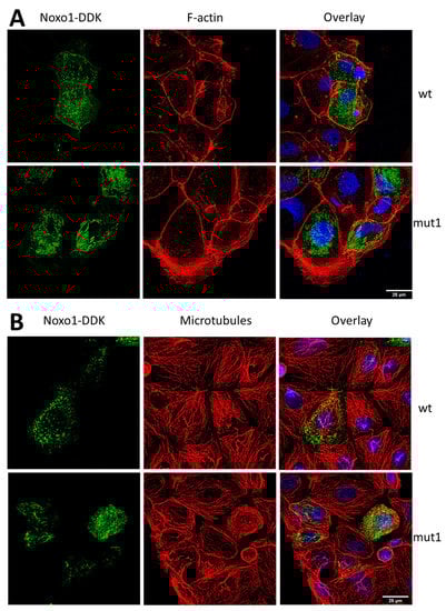 As shown in Figure 6, wt Noxo1 is predominantly membrane-associated with partial localization to a cytoskeletal compartment resulting in cellular labeling as dots or short sticks. The mut1 Noxo1 switches the localization to a predominantly cytoskeletal localization and leads to filamentous cellular labeling. We, therefore, sought to characterize with which cytoskeletal element Noxo1 is associated. Figure 10 shows immunostaining of Caco-2 cells overexpressing wt Noxo1 or mut1 Noxo1 for Noxo1 and for the F-actin or microtubules. The F-actin organization was examined in Caco2 transfected cells using Alexa Fluor 594 phalloidin (red). WT Noxo1-DDK or mut1 Noxo1-DDK showed actin stress fibers crossing over the cytoplasm and bundles of F-actin beneath the plasma membrane. In addition, mut1 Noxo1-DDK cells did not display any morphological alterations compared with wt Noxo1-DDK transfected cells (Figure 10A, middle panels).