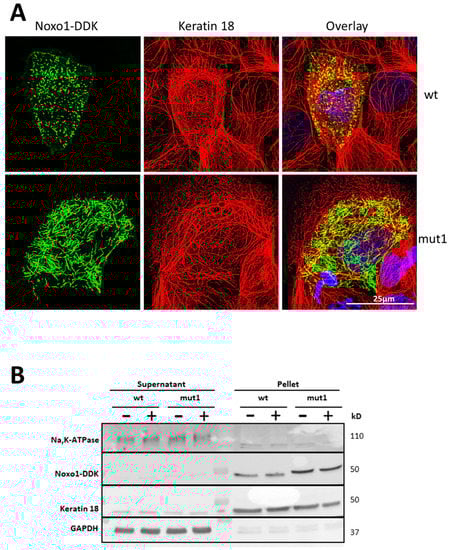 There is no particular colocalization of Noxo1 with F-actin except for a few peripheral membrane areas for either the wt or mut1 form of Noxo1 (Figure 10A). This rather uncommon colocalization is compatible with the regulation of Nox and actin by Rho-GTPases in membrane signaling hubs. Microtubule organization in cells transfected with wt Noxo1-DDK or mut1 Noxo1-DDK was assessed with alpha-tubulin antibody (Figure 10B, red). Wt Noxo1-DDK or mut1 Noxo1-DDK cells displayed microtubules in the cytoplasm as individual filaments until they were arrested by the cortical F-actin (Figure 10B, middle panels). The labeling of Noxo1 and microtubules show that there are some areas of colocalization between peripheral microtubules and Noxo1 (Figure 10B). Moreover, this peripheral punctiform colocalization seems to be compatible with the labeling of the ends plus microtubules classically involved in the regulation of focal contact and cell adhesion properties, where a role for Nox1 has been demonstrated []. These results, taken together, do not seem to show a difference between wt Noxo1 and mut1 Noxo1 with respect to their localization with F-actin or microtubules that could explain the shift of mut1 Noxo1 into a cytoskeletal compartment. Intermediate filaments represent the third type of cytoskeleton present in cells. Proteins such as keratins or vimentin form filaments of intermediate size to that of actin filaments and microtubules. Some publications refer to an interaction between Nox1 and keratin 18 [] and some mass spectrometry experiments (Appendix A, Figure A4) performed on our models make us decide to analyze the association of Noxo1 with keratin 18. Of the three cytoskeletal components, keratin 18 shows the greatest difference in the labeling between wt and mut1 Noxo1 (Figure 11A). Keratin 18 organization in cells transfected with wt Noxo1-DDK or mut1 Noxo1-DDK was assessed with an anti-keratin 18 antibody (Figure 11A, red). Wt Noxo1-DDK or mut1 Noxo1-DDK cells displayed keratin 18 in the cytoplasm as individual filaments (Figure 11A, middle panels, red). Thus, keratin 18 organization is not different between wt Noxo1-DDK or mut1 Noxo1-DDK Caco-2 cells. The colocalization between wt Noxo1 and keratin 18 takes place in a punctate form at the crossing of the small wt Noxo1 rods, which seem to colocalize when they cross some keratin 18 filaments of the peripheral crown perpendicularly. Concerning mut1 Noxo1, the colocalization seems to be more intense than with wt Noxo1 and partially follows keratin 18 filaments (Figure 11A, right panels, yellow). Only part of the Noxo1 filaments is colocalized with keratin 18 filaments suggesting that Noxo1 may interact with another filament protein or form intracellular filaments itself. Figure 11B shows an immunoblot of Noxo1, keratin 18, Na,K-ATPase, and GAPDH expression in Caco-2 cells overexpressing wt Noxo1 or mut1 Noxo1 and lysed in RIPA buffer. Keratin 18 is well localized in the same insoluble compartment as Noxo1. There was no difference in keratin 18 expression between wt and mut1 Noxo1 cells in all conditions. These distributions are independent of whether F-actin is intact or depolymerized in all conditions.