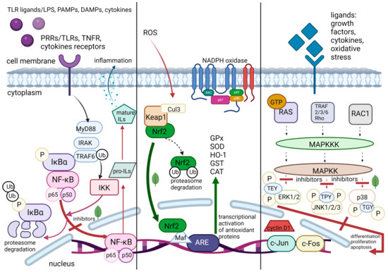 Changing NOD1 and NOD2 conformation leads to their self-oligomerization. Receptor-interacting serine (Ser)/threonine (Thr)-protein kinase 2 (RIPK2) is recruited through homotypic CARD–CARD interactions. Next, TAK1 Ser-Thr kinase, which is a prerequisite for activation of a multi-subunit IκB kinase (IKK) complex and mitogen-activated protein kinases (MAPK) pathway, is recruited and activated via the RIPK2 Ser-Thr kinase. The post-translation modification of proteins with ubiquitin affects many steps in the NF-κB pathway. The crucial IKK-mediated phosphorylation of the NF-κB inhibitor IκBα leads to its polyubiquitination. The proteasome allows NF-κB to translocate to the nucleus and influence the expression of target genes [26]. This molecular step is most often targeted by plant-derived compounds.