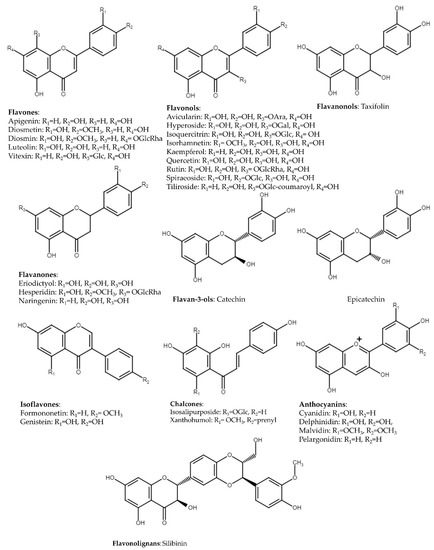 Flavonoids are a particularly widely distributed class of compounds in the plant kingdom. Flavones possess a ketone in position 4 of the C ring and are characterized by the presence of a double bond (C-2/C-3) in the flavonoids skeleton and the lack of substitution at C-3. Most flavones of vegetables and fruits have a hydroxyl group in position 5 of the A ring. On the other hand, hydroxylation in other positions as in position 7 of the A ring or 3′ and 4′ of the B ring is taxonomically dependent (Figure 2).