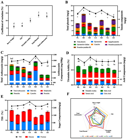 Quality characterization of ‘Cabernet Sauvignon’ berries in seven regions including DZ, LX, PL, RZ, RS, TA, and ZZ at maturity. (A) Measurement of Coefficient of Variation (C.V) related to berry weight, TSS, titratable acidity, total phenols, and total anthocyanins of ‘Cabernet Sauvignon’ at maturity level. (B–E) Analysis of main components related to total phenolics, total anthocyanins, titratable acid, and TSS, respectively. The broken line represents the quality traits in different regions. The bar represents the charge ratio in different regions from half-véraison to maturity. The different letters indicate the significant differences between regions (p ≤ 0.05) using Duncan’s test. Experiments were performed using three replicates. mg/g refers to fresh weight. (F) Evaluation of seven regions using radar map according to quality characterization.