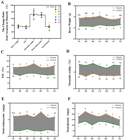 The change ratio of five quality indices during half-véraison and maturity stages in grape berries belonging to different regions. Variance ratio (A) and changes of five quality indices including berry weight (B), TSS (C), titratable acids (D), anthocyanins (E), and total phenolics (F) between half-véraison and maturity stages of grape berries. The broken line represents the quality indices in seven regions including DZ, LX, PL, RZ, RS, TA, and ZZ. The green and orange lines represent the change in different regions in the half-véraison and maturity stages. The different letters indicate the significant differences between regions (p ≤ 0.05) using Duncan’s test. Experiments were performed using three replicates.