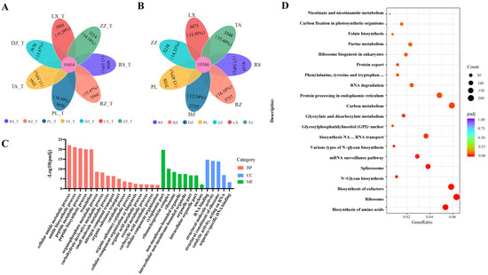 The number of genes detected during berry development (from half-véraison to maturity) varied substantially in this study. At half-véraison, the highest and lowest number of genes were in the collected samples of RS (23,480 genes) and TA (21,995 genes), respectively. At maturity, the lowest was 22,085 belonging to the DZ region, and the highest was 23,479 belonging to the RS region. The petal map indicated that about 85% of the genes were co-expressed and about 15% of the unique genes across regions (Figure 3A,B). Assessing the function of co-expressed genes among regions, the co-expressed genes were enriched for a total of 916 biological functional groups and 119 metabolic pathways (Tables S5 and S6). The major cellular processes including cytoplasmic, nuclear, small molecule metabolism cytosolic amide metabolism, peptide metabolism, organic acid metabolism, and other biological functions, had been significantly enriched and involved numerous genes (padj ≤ 0.05) (Figure 3C and Figure S5A). Additionally, many co-expressed genes had been significantly enriched into metabolic pathways such as the ribosome, carbon metabolism, amino acid biosynthesis, and cofactor biosynthesis (Figure 3D and Figure S5B), which likely contributed to the growth and development of grapes.