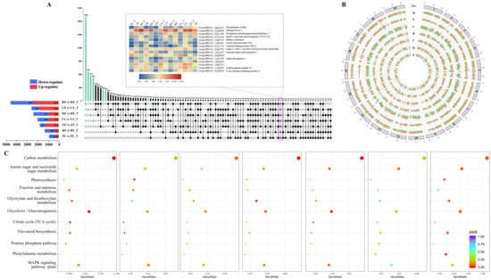 Determination of up- and down-regulated genes among the collected samples from seven regions. (A) Up-set showing the overlapping and unique genes of different regions, the blue column depicts down-regulate genes, the red column depicts up-regulate genes, and the heatmap represents DEGs based on FPKM (fragments of transcripts per million fragments mapped) value. (B) Circos diagram demonstrates the pattern of DEGs in different regions, which are labeled from a to g. The 19 chromosomes are shown by the first outer ring. The seven concentric rings from outside to inside represent the corresponding seven regions in this figure. Orange color in each cycle represents DEGs based on FPKM value at maturity, while green color represents DEGs at half-véraison. (C) Plot shows the degree of enrichment of KEGG metabolic pathways in different regions. The abscissas represent the GeneRatio, and the ordinate represents KEGG pathway. The GeneRatio refers to the ratio of the sample number to the background number enriched in the pathway. The letters a–g called for PL vs PL_T, RS vs RS_T, ZZ vs ZZ_T, TA vs TA_T, DZ vs DZ_T, LX vs LX_T, and RZ vs RZ_T, respectively. In this figure, T means half-véraison.