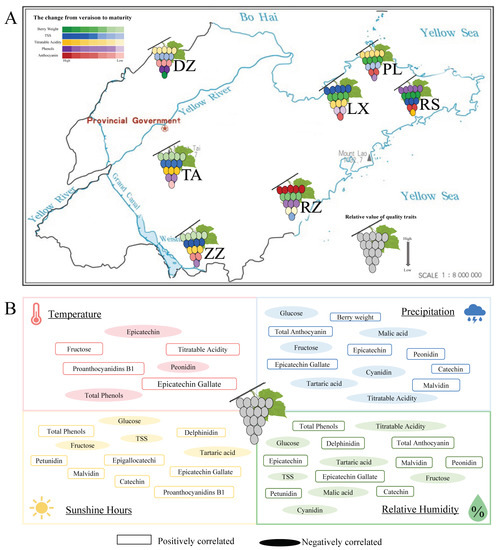 The wine-grape-growing regions of China display unique ecological conditions either from south to north or from east to west. In this work, the seven regions including Dezhou (DZ), Laixi (LX), Penglai (PL), Rizhao (RZ), Rushan (RS), Tai’an (TA), and Zaozhuang (ZZ) were in Shandong province, China (Figure S1). The environmental conditions of those regions were distinctly different. Among them, the average annual temperature ranged from 13.39 to 15.69 °C, precipitation ranged from 747.33 to 1376.91 mm, the annual sunshine hours ranged from 1552.8 to 1694.17, the relative humidity ranged from 56.15 to 85.8% (Table S1). Pearson’s correlation analysis showed that environmental conditions significantly affected grape quality characteristics across regions (Figure S2).