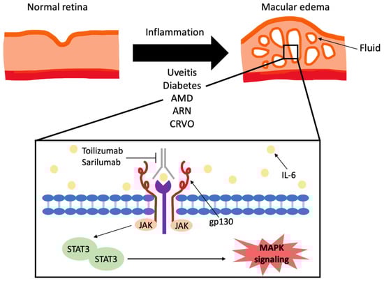 Interleukin-6 inhibitors in the treatment of macular edema. Abbreviations: age related macular degeneration (AMD), acute retinal necrosis (ARN), central retinal vein occlusion (CRVO), interleukin-6 (IL-6), interleukin-6 receptor (IL-6R), glycoprotein 130 (gp130), Janus activated kinase (JAK), signal transducer and activator of transcription 3 (STAT-3), JAK-SHP2-Ras-mitogen activated protein kinase (MAPK).