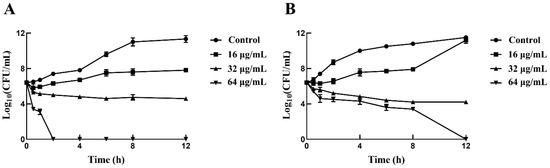 Time-killing curves for L. monocytogenes treated with sertraline in three concentrations (16 μg/mL, 32 μg/mL and 64 μg/mL) and untreated L. monocytogenes. (A) L. monocytogenes ATCC 11915 treated with sertraline; (B) L. monocytogenes 001 treated with sertraline. Values represent the average of three independent measurements.