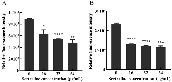 Effects of different concentrations of sertraline on L. monocytogenes cell membrane, which was indicated by the relative fluorescence intensity. (A) L. monocytogenes ATCC 11915 treated with sertraline; (B) L. monocytogenes 001 treated with sertraline. Each value is the mean of the three independent parallel control measurements, and the bars represent the standard deviation of the parallel samples, * p ≤ 0.05; ** p ≤ 0.01; *** p ≤ 0.001; **** p ≤ 0.0001.