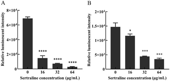 Effects of different concentrations of sertraline on the intracellular ATP content of L. monocytogenes, which was indicated by the relative luminescence intensity. (A) L. monocytogenes ATCC 11915 treated with sertraline; (B) L. monocytogenes 001 treated with sertraline. Each value is the mean of the three parallel control measurements, and the bars represent the standard deviation of the parallel samples, * p ≤ 0.05; *** p ≤ 0.001; **** p ≤ 0.0001.