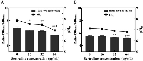 Effects of different concentrations of sertraline on pHin of L. monocytogenes. The pH value was calculated by the ratio of the fluorescence emission intensity at 490 nm to 440 nm. In the Figure, the ratio of the fluorescence intensity is shown in the column, and the pH value in the cell is shown in the broken line. (A) L. monocytogenes ATCC 11915 treated with sertraline; (B) L. monocytogenes 001 treated with sertraline. Each value is the mean of the three parallel control measurements, and the bars represent the standard deviation of the parallel samples, * p ≤ 0.05; ** p ≤ 0.01; *** p ≤ 0.001.
