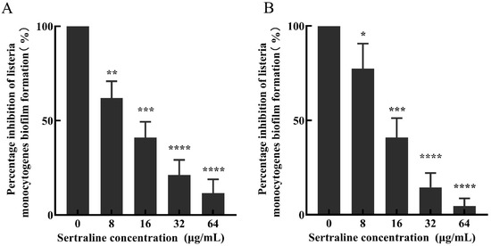 The inhibitory effect of sertraline at different concentrations on the biofilm formation of L. monocytogenes was expressed as the percentage of biofilm formation inhibition. (A) L. monocytogenes ATCC 11915 treated with sertraline; (B) L. monocytogenes 001 treated with sertraline. Each value is the mean of the three parallel control measurements, and the bars represent the standard deviation of the parallel samples, * p ≤ 0.05; ** p ≤ 0.01; *** p ≤ 0.001; **** p ≤ 0.0001.