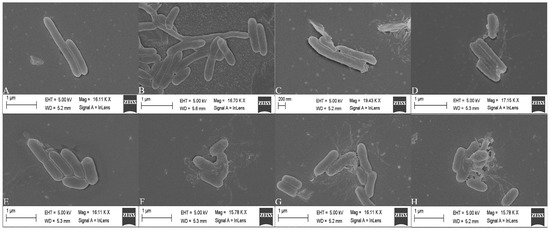 Scanning electron microscope images of L. monocytogenes cells treated with sertraline at different concentrations. (A) L. monocytogenes ATCC 11915 untreated; (B) L. monocytogenes ATCC 11915 treated with sertraline at 16 μg/mL; (C) L. monocytogenes ATCC 11915 treated with sertraline at 32 μg/mL; (D) L. monocytogenes ATCC 11915 treated with sertraline at 64 μg/mL; (E) L. monocytogenes 001 untreated; (F) L. monocytogenes 001 treated with sertraline at 16 μg/mL; (G) L. monocytogenes 001 treated with sertraline at 32 μg/mL; (H) L. monocytogenes 001 treated with sertraline at 64 μg/mL.