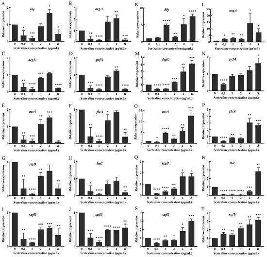 Changes in relative expression levels of virulence genes in L. monocytogenes treated with different concentrations of sertraline. (A–J) represents L. monocytogenes ATCC 11915, (A) hly; (B) agrA; (C) degU; (D) prfA; (E) actA; (F) flaA; (G) sigB; (H) ltrC; (I) sufS; (J) sufU. (K–T) represents L. monocytogenes 001, (K) hly; (L) agrA; (M) degU; (N) prfA; (O) actA; (P) flaA; (Q) sigB; (R) ltrC; (S) sufS; (T) sufU. Values represent the average of three independent measurements. * p ≤ 0.05; ** p ≤ 0.01; *** p ≤ 0.001; **** p ≤ 0.0001.