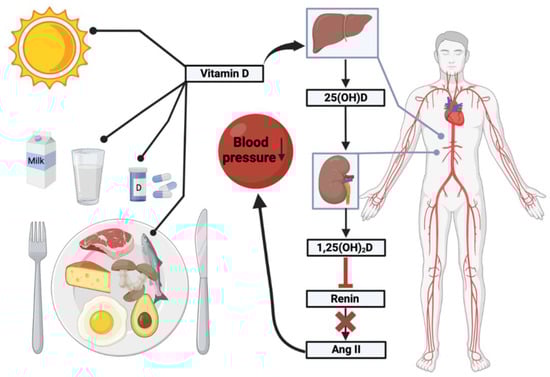 High blood pressure (hypertension) is a serious risk factor for cardiovascular diseases, such as coronary artery disease, myocardial infarction, or stroke, if untreated [1]. Study results revealed that vitamin D deficiency ameliorates the development of hypertension (HT) [1,2]. Vitamin D deficiency (25-OH-D < 30 ng/mL) is an independent risk factor for high blood pressure and is involved in the promotion of cardiovascular mortality [3].