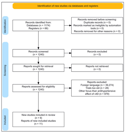 The literature searched for this review was found through online databases, clinical trials, and very few online webpages. The online databases include PubMed (https://pubmed.ncbi.nlm.nih.gov/, accessed on 11 December 2022), Scopus (https://www.scopus.com/search/form.uri?display=basic#basic, accessed on 11 December 2022), and Clinical Trials (https://clinicaltrials.gov/, accessed on 11 December 2022). Original papers were found from a systematic literature search using several different databases, and from written reviews. The searches were (if possible) restricted to be from 2017–2022, ensuring the most recent trials would be found; however, earlier trials have also been included. The search terms were ((“vitamin D”) OR (cholecalciferol)) AND (hypertension). Clinical trials in this review are included to assess the efficacy of vitD supplementation on hypertension. The search process is outlined in the PRISMA flow diagram (Figure 2).