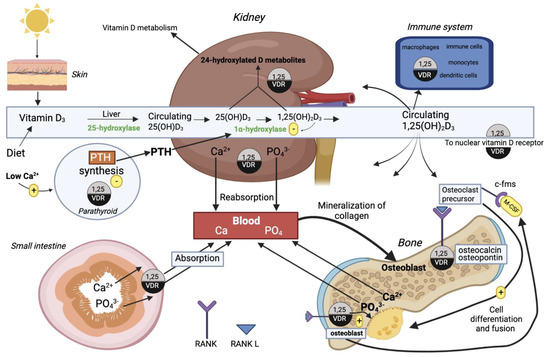 Effects of vitamin D and its metabolites in calcium homeostasis, bone metabolism, and the immune system. Vitamin D3 obtained from the diet or synthesized by photoconversion from sunlight is converted into the hormonal form 1,25(OH)2D3 by two hydroxylations occurring in the liver and kidney, respectively. After this conversion, 1,25(OH)2D3 circulates in blood to target tissues. The integrated actions of the 1,25(OH)2D3 hormone via binding to the intracellular VDR, to control calcium homeostasis in bone, kidney, intestine, and parathyroid, is shown above [64]. This figure was made using Biorender.com, agreement number UN24V0NHC0.