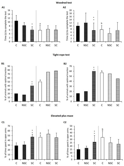 Behavioral parameters. (A) Time to complete the wood-rod test in seconds. (B) Percentage (%) of animals with optimal traction in the tight-rope test. (C) Percentage (%) of time spent in open arms in the elevated plus maze. The results corresponding to chronologically adult and old mice are shown in A1, B1, and C1, and to adult prematurely-aging mice (PAM) and non-prematurely-aging mice (NPAM) are shown in A2, B2, and C2. Each column shows the mean ± standard deviation of 6–15 values corresponding to the same number of animals. After a statistical analysis comparing the means with the Mann–Whitney U test for independent samples, significant differences were observed in the indicated experimental groups. *: p < 0.05 with respect to the values obtained in their corresponding control group. +: p < 0.05 with respect to the values obtained in the corresponding NSC group. a: p < 0.05 with respect to the values obtained in old mice C. b: p < 0.05 with respect to the values obtained in PAM C. C: control group (old mice/PAM: n = 6; adult mice/E-NPAM: n = 7). NSC: non-skin-to-skin contact (old mice/PAM: n = 6; adult mice/E-NPAM: n = 15). SC: skin-to-skin contact (old mice/PAM: n = 6; adult mice/E-NPAM: n = 15).
