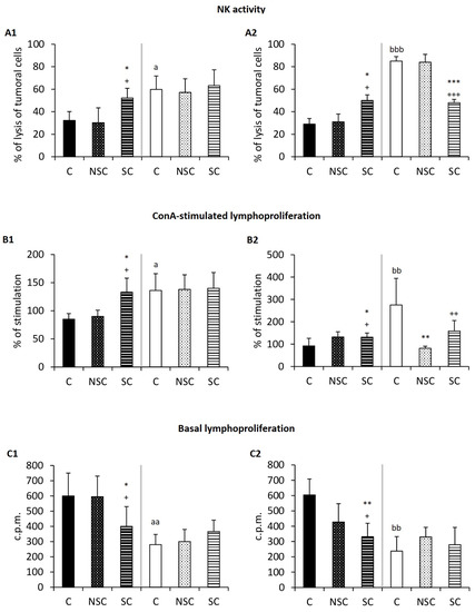 Changes in immune parameters. (A) Natural killer activity expressed as % of lysis of tumoral cells. (B) Percentage (%) of ConA-stimulated lymphoproliferation. (C) Basal lymphoproliferation in counts per minute (c.p.m.). The results corresponding to peritoneal leukocytes from chronologically adult and old mice are shown in A1, B1, and C1, and from adult prematurely-aging mice (PAM) and non-prematurely-aging mice (NPAM) are shown in A2, B2, and C2. Each column shows the mean ± standard deviation of 6–15 values corresponding to the same number of animals. After a statistical analysis comparing the means with the Student’s t-test for independent samples, significant differences were observed in the indicated experimental groups. *: p < 0.05, **: p < 0.01, ***: p ≤ 0.001 with respect to the values obtained in their corresponding control group. +: p < 0.05. ++: p < 0.01, +++: p ≤ 0.001 with respect to the values obtained in the corresponding NSC group. a: p < 0.05, aa: p < 0.01 with respect to the values obtained in old mice C. bb: p < 0.01, bbb: p < 0.001 with respect to the values obtained in PAM C. C: control group (old mice/PAM: n = 6. adult mice/E-NPAM: n = 7). NSC: non-skin-to-skin contact (old mice/PAM: n = 6; adult mice/E-NPAM: n = 15). SC: skin-to-skin contact (old mice/PAM: n = 6; adult mice/E-NPAM: n = 15). NK: natural killer. ConA: concanavalin. c.p.m.: counts per minute.