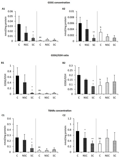 Changes in oxidative parameters in peritoneal leukocytes. (A) GSSG concentration in nmol/mg protein. (B) GSSG/GSH ratio. (C) TBARs concentration in nmol/mg protein. The results corresponding to peritoneal leukocytes from chronologically adult and old mice are shown in A1, B1, and C1, and from adult prematurely-aging mice (PAM) and non-prematurely-aging mice (NPAM) are shown in A2, B2, and C2. Each column shows mean ± standard deviation of 6–15 values corresponding to the same number of animals. After a statistical analysis comparing means with the Student’s t-test for independent samples, significant differences were observed in the indicated experimental groups *: p < 0.05, **: p < 0.01 with respect to the values obtained in their corresponding control group. +: p < 0.05 with respect to the values obtained in the corresponding NSC group. aa: p < 0.01 with respect to the values obtained in old mice C. b: p < 0.05, bb: p < 0.01 with respect to the values obtained in PAM C. C: control group (old mice/PAM: n = 6; adult mice/E-NPAM: n = 7). NSC: non-skin-to-skin contact (old mice/PAM: n = 6; adult mice/E-NPAM: n = 15). SC: skin-to-skin contact (old mice/PAM: n = 6; adult mice/E-NPAM: n = 15). GSSG: oxidized glutathione. GSH: reduced glutathione. TBARs: thiobarbituric acid reactive substances.