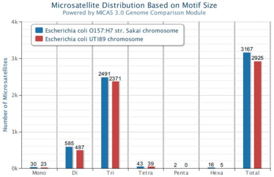 The analysis of many bacterial genomes shows that the most common microsatellite sequences in genomes represent repetitions of three nucleotides (trinucleotide repeats). Figure 1 shows the distribution of microsatellites in the genomes of Escherichia coli UTI89 and Escherichia coli O157:H7 Sakai, representing two essential and not always genetically distinguishable pathotypes of this species, ExPEC (Extraintestinal Pathogenic Escherichia coli) [8,9,10] and IPEC (Intestinal Pathogenic Escherichia coli) [9]. The analysis was performed with MICdb software 3.0 [11] on the MICAS 3.0 platform using E. coli UTI89 and E. coli O157:H7 strain Sakai genomes available at the database.