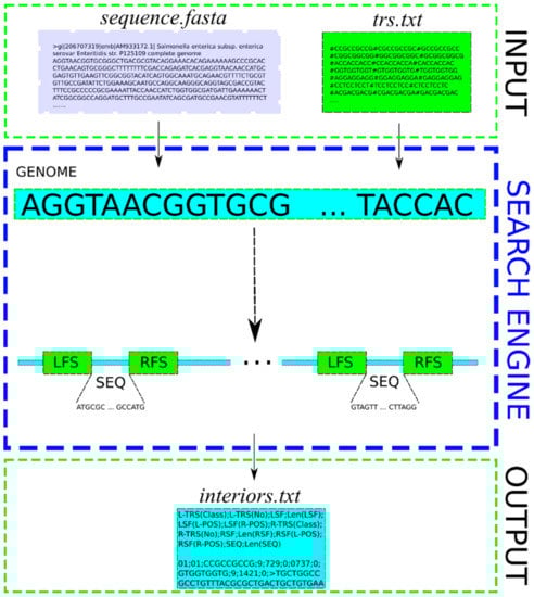 Schematic diagram of the functioning of the engine of TRS-omix. The input data that contain nucleotide sequences in the genome (called sequence.fasta) are analyzed for the presence of TRS motifs, and the TRS-omix search engine produces a file (called interiors.txt) containing useful information for further genome analysis. Labeling: LFS—means the left flanking sequence (at least triple repetition of the same TRS from the 5′ direction), RFS—means the right flanking sequence (at least triple repetition of the same TRS from the 3′ direction), SEQ—means an extracted DNA sequence (see at https://github.com/TRS-omix/software, accessed on 21 February 2023).