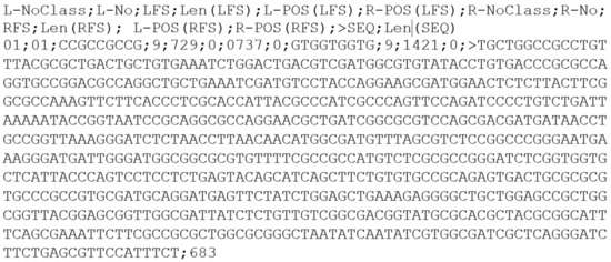 The software was elaborated in such a manner as to enable searching TRS motifs in FASTA files downloaded, for instance, from GenBank—the file called sequence.fasta. After starting the software, the examined linear or circular structure ought to be selected and then the determined value of minimal or maximal length of the sequence searched for. In the case where the minimal value is identical with the maximal one, we want to extract the sequences found between TRS motifs of a concrete length. In the case where these values vary, we define extracting sequences of the existing TRS motifs of the length found within the defined range. On finishing the work of the search engine, the file interiors.txt is returned (see Figure 3).