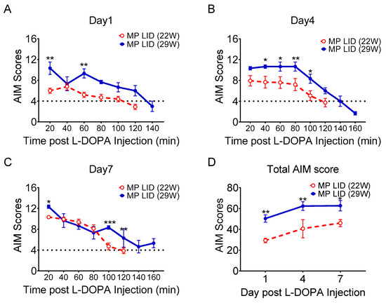 Effect of L-DOPA treatment on MitoPark (MP) of different ages. Comparison of AIM scores between mice that received early PT320 treatment (treatment begun at 5 weeks old and AIM recorded at 22 weeks old) and late treatment (treatment begun at 17 weeks old and AIM recorded at 29 weeks old). AIM scores at (A) 1, (B) 4, and (C) 7 days of L-DOPA/carbidopa treatment in 22-week- and 29-week-old MP mice as well as overall AIM scores (D). (A) AIM scores in the late treatment group were higher than those in the early group at almost all time points. (B) AIM scores were higher in the late treatment group at the middle and late recording time points on day 4. (C) Abnormal dyskinesias were longer in the late treatment group. (D) Total AIM scores were higher in the late treatment group from day 1 to day 7 after induction protocol. Two-way analysis of variance (ANOVA) followed by Bonferroni post hoc test for multiple comparisons. * p < 0.05, ** p < 0.01, *** p < 0.001 compared with MP LID (22W).