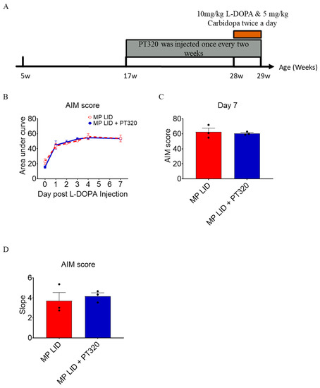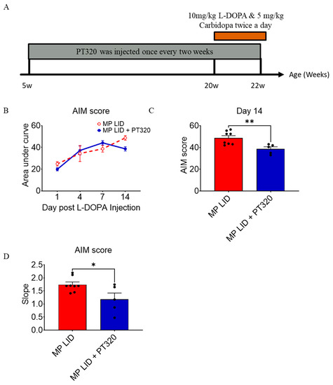 The early administration of PT320 ameliorated the severity of dyskinesia induced by L-DOPA injection after a 2-week induction protocol in 20-week-old MP. (A) Early PT320 treatment was started at 5 weeks of age in MP mice while the LID induction protocol was initiated in MP mice at 20 weeks of age. (B) The severity of dyskinesia was measured via AIM scores. (C) The AIM scores of the PT320 treatment group showed less severe dyskinesia than those of the non-treatment group (MP LID group). (D) The slopes of the AIM scores in the PT320 treatment group were less than those of the non-treatment group. Two-way analysis of variance (ANOVA) followed by Bonferroni post hoc test for multiple comparisons * compared with MP LID. * p < 0.05, ** p < 0.01 compared with MP LID. MP LID (N = 8) MP LID + PT 320 (N = 5).