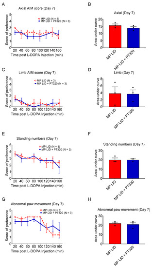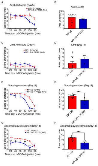 The detailed AIM score components were analyzed between the early 5W PT320 treatment and non-treatment groups at Day 14 of LID induction. (A) The axial scores revealed that abnormal axial deviation decreased to normal at the last recording time (B) The area under the curve of the scores revealed less severe dyskinesia in the PT320 treatment group compared with the non-treatment group (MP LID group). (C,D) There were no significant differences in limb AIM scores between groups. (E) Abnormal standing time decreased significantly in the PT320 treatment group with less area under the curve in the PT320 treatment group (F). (G) The score for abnormal paw movement was less in the PT320 treatment group with a significantly lower area under the curve in the PT320 treatment group (H). Two-way analysis of variance (ANOVA) followed by Bonferroni post hoc test for multiple comparisons. * p < 0.05, ** p < 0.01, *** p < 0.001 compared with MP LID.