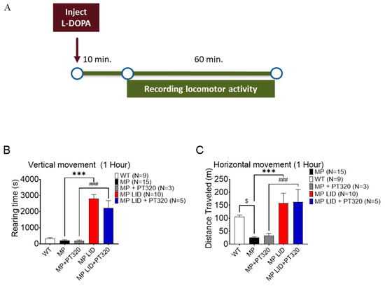 Effect of PT320 combined with L-DOPA on MP locomotion. Locomotor assessments showed no significant differences between groups. (A) Experimental protocol for locomotor assessment: one hour of behavioral recording began 10 min after L-DOPA injection. (B) There were no significant differences in vertical movement between the MP LID and MP LID with PT320 treatment groups (red bar for MP LID vs. blue bar for MP LID with PT320). (C) There were no significant differences in horizontal travel distance between the MP-LID and MP LID with PT320 treatment groups. One-way analysis of variance (ANOVA) followed by Bonferroni post hoc test for multiple comparisons. *** p < 0.001 compared with MP LID, ### p < 0.001 Compared with MP + PT320, $ p < 0.05 compared with WT.