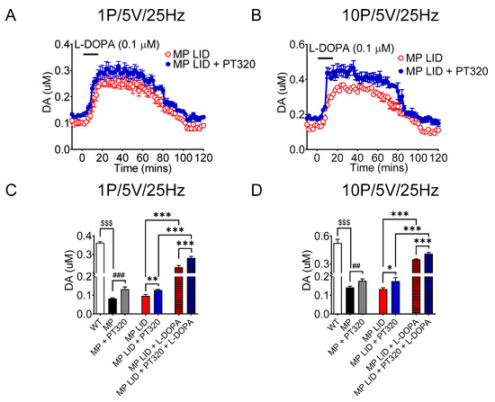 In line with our previous study, administration of levodopa increased DA release in the dorsal striatum of the MitoPark LID group (Figure 5A,B). Notably, the release of DA following L-DOPA infusion was larger in the MitoPark mice receiving early treatment of PT320 than in untreated mice (Figure 5C,D). During tonic or phasic stimulation, the release of DA in PT320-treated L-DOPA-primed MitoPark mice actually increased compared to that of the MitoPark LID group (Figure 5A,B). The average concentration of tonic or phasic (bursting) DA release after L-DOPA administration was higher in the L-DOPA-primed MitoPark mice receiving early PT320 treatment than in the MitoPark LID group (Figure 5C,D). Taken together, early treatment with PT320 did not attenuate increments of tonic and phasic DA release induced by L-DOPA, which is related to LID development. Instead, this regimen of PT320 treatment might preserve the tonic or phasic DA release in the DA-denervated striatum exposed to L-DOPA.