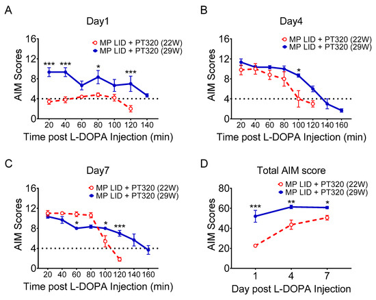 AIM scores comparing the early PT320 treatment (treatment begun at 5 weeks old and AIM recorded at 22 weeks old) and late PT320 treatment groups (treatment begun at 17 weeks old and AIM recorded at 29 weeks old). (A) AIM scores in the late treatment group were higher than in the early treatment group at almost all recording time points. (B) AIM scores were higher in the late treatment group at the middle and late recording time points on Day 4. (C) The duration of abnormal dyskinesia was longer in the late treatment group. (D) Total AIM scores were higher in the late treatment group from day 1 to day 7 of the induction protocol than scores in the early treatment group during a similar period. Two-way analysis of variance (ANOVA) followed by Bonferroni post hoc test for multiple comparisons. * p < 0.05, ** p < 0.01, *** p < 0.001 compared with MP LID + PT320 (22W).
