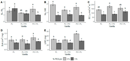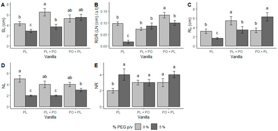 Water stress affects growth of Vanilla planifolia (PL) seedlings and V. planifolia × V. pompona (PL × PO) and V. pompona × V. planifolia (PO × PL) hybrids. (A) Stem length (SL); (B) relative growth rate (RGR); (C) root length (RL); (D) number of new leaves (NL); and (E) number of new roots (NR). Gray bars: 0% PEG (control group, −0.08 mPa). Black bars: 5% PEG and hydric stress (−0.49 mPa). Bars with different letters are significantly different (p < 0.05), according to GLM test.