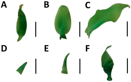 Leaves of vanilla seedlings without and with PEG-induced water stress. (A,D) Vanilla planifolia (PL); (B,E) V. planifolia × V. pompona (PL × PO); (C,F) V. pompona × V. planifolia (PO × PL); (A–C) control leaves (−0.08 mPa); and (D–F) leaves produced under water stress (−0.49 mPa). Scale bars = 10 mm.