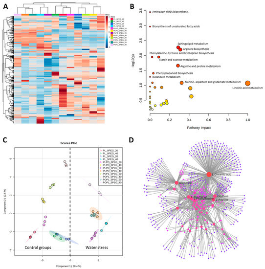 Metabolomics of Vanilla plants with and without water stress. (A) Hierarchical ordering heatmap, (B) pathway analysis, (C) principal component analysis (PCA), and (D) network analysis of metabolomic data obtained by UPLC-MS-QTOF from vanilla seedlings exposed to 20 and 40 days of PEG-induced water stress. The heatmap was generated using Pearson and Ward for distance measure and clustering algorithm, respectively. The pathway analysis was determined by Mummichog algorithm, KEGG database, and Oryza sativa library. PL: Vanilla planifolia, PLPO: V. planifolia × V. pompona, POPL: V. pompona × V. planifolia, 0 PEG: control group (−0.08 mPa), 5 PEG: hydric stress (−0.49 mPa), 20: 20 days of water stress exposure, and 40: 40 days of water stress exposure.