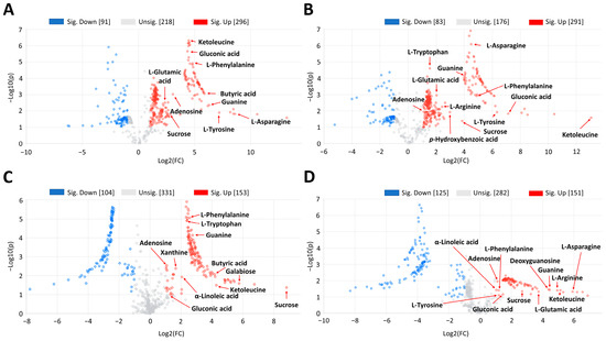 Volcano plots of metabolomic data obtained by UPLC-MS-QTOF comparing V. planifolia × V. pompona (PL × PO) and V. pompona × V. planifolia (PO × PL) hybrids versus V. planifolia (PL) under water stress exposure. (A) PL × PO/PL at 20 days of water stress exposure. (B) PO × PL/PL at 20 days of water stress exposure. (C) PL × PO/PL at 40 days of water stress exposure. (D) PO × PL/PL at 40 days of water stress exposure. Some differential metabolites (fold change >2) that are tentatively identified are shown in each subfigure; the complete list is in Tables S3–S6.