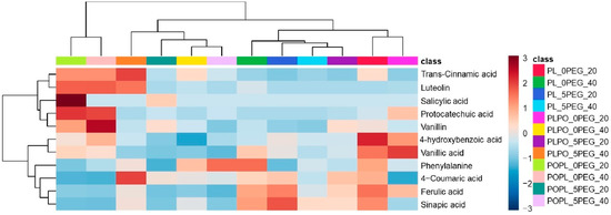 Hierarchical ordering heatmap of phenolic compounds identified by targeted metabolomics as result of exposure of vanilla seedlings to 20 and 40 days of PEG-induced water stress. The heatmap was generated using Pearson and Ward for distance measure and clustering algorithm, respectively. PL: Vanilla planifolia, PLPO: V. planifolia × V. pompona, POPL: V. pompona × V. planifolia, 0 PEG: hydration status (control group, −0.08 mPa), 5 PEG: hydric stress (−0.49 mPa), 20:20 days of water stress exposure, and 40:40 days of water stress exposure. Complementary information about the phenolic compounds is shown in Table S7.