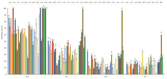 | A9 | 27 ± 5.77 | - | 87 ± 5.77 | A27 | 100 ± 0.00 | 30 ± 0.00 | 17 ± 5.77 |