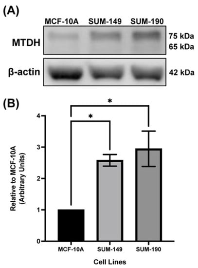 Basal MTDH expression in IBC cell line models and non-cancerous mammary epithelial cells. (A) Total protein lysates of MCF-10A, SUM-149, and SUM-190 were probed using the indicated antibodies. β-actin was used as a loading control. (B) Densitometry quantification of MTDH in MCF-10A, SUM-149, and SUM-190 cells. Data are expressed relative to MCF-10A cells. Ordinary one-way ANOVA with Bonferroni’s multiple comparison test, * p < 0.05. Results are shown as Mean ± SEM. The experiment was performed at least three times. The approximate molecular weight of MTDH bands are stated to be 75 kDa and 65 kDa, according to the manufacturer’s description.